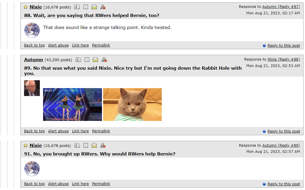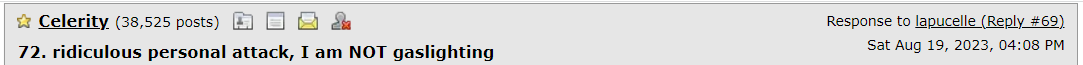 (17,984 posts)I posted first in this thread on Friday 8/18 before you even posted. Does that win me anything or give me any kind of license to post again if I want to? A very intelligent and well liked poster answered me 5 hours later while I was sleeping. Then I got busy during the day and couldn't respond. You insinuating that I can't post in a thread and answer someone's posts without your approval looks like that gaslighting comment might be accurate.