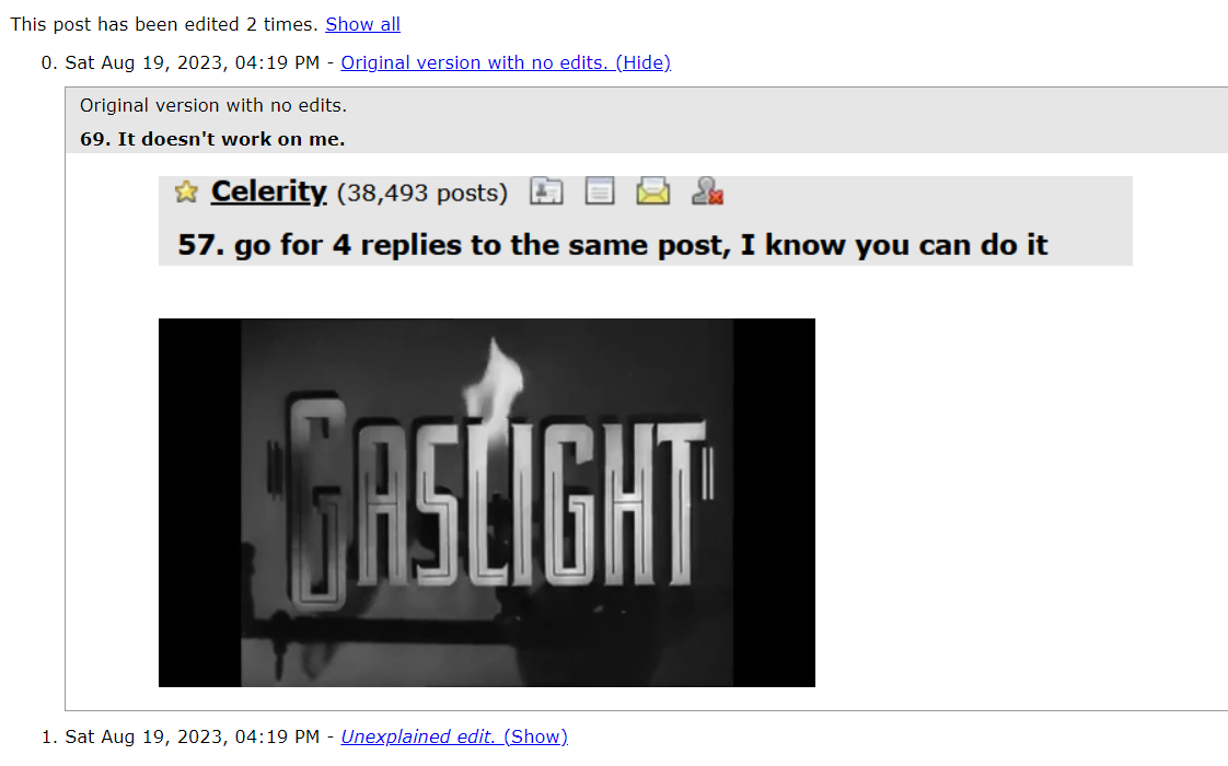 Telling people they are not seeing what they can easily scroll up and see with their own two eyes is gaslighting in a highly abusive way.
