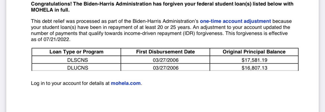 Up to now, my interest was almost half of the principal. I still can't believe it. I don't believe any other President would make this one of their priorities like Biden did. Bless that man and all the people like Elizabeth Warren and Bernie Sanders who continued pushing for this. I don't think they have any idea how life changing this is for almost a million people shackled to mountains of debt when they initially borrowed modest amounts.