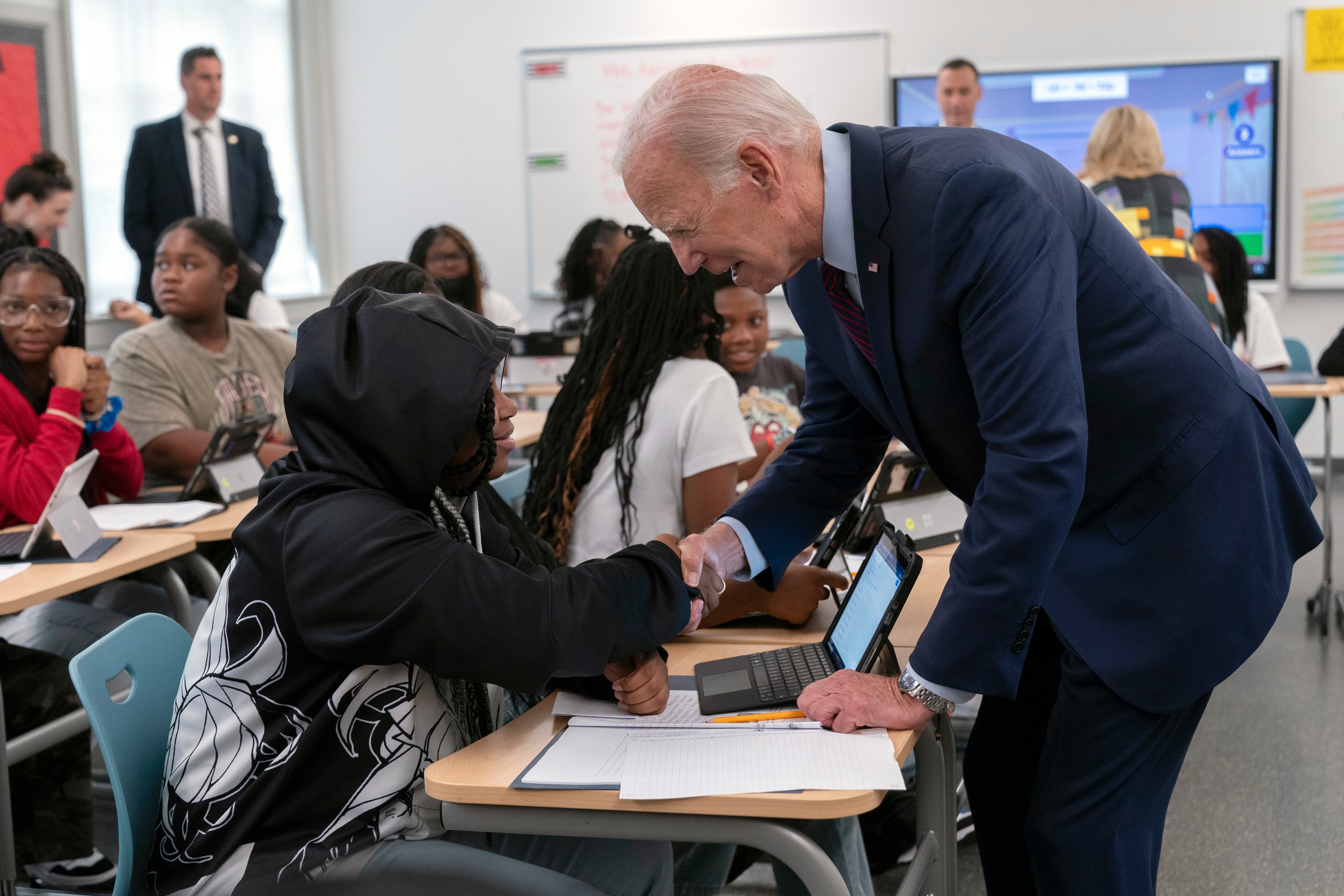 Biden, accompanied by first lady Jill Biden, first visited the lunchroom where a big banner touted the schools valued traits of excellence, responsibility, integrity and communications. Then they dropped by an eighth-grade math class at the 300-student campus.