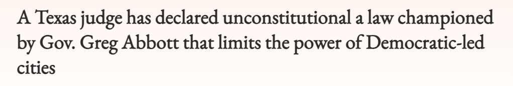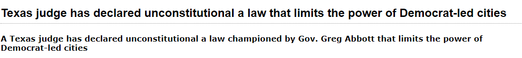 (22,325 posts)Texas judge has declared unconstitutional a law that limits the power of Democrat-led cities