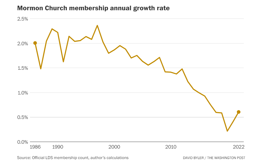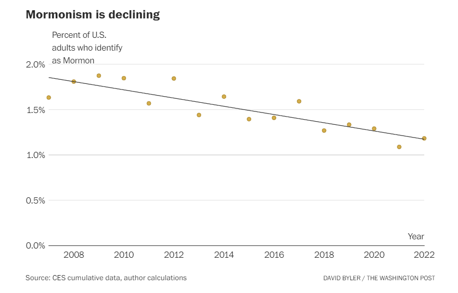 According to the Cooperative Elections Study a long-running survey with enough respondents to reliably track Mormon affiliation 1.8 percent of American adults identified as Mormon in 2007. In 15 years, that total dropped to 1.2 percent. In raw terms, thats a net loss of roughly 1 million adult members. The LDS Church maintains a more detailed count, but it might overestimate its strength. Its records include children and inactive members, some of whom are former Mormons who skipped the bureaucratic chore of removing their names from the churchs rolls. The churchs count shows positive but rapidly decelerating growth.