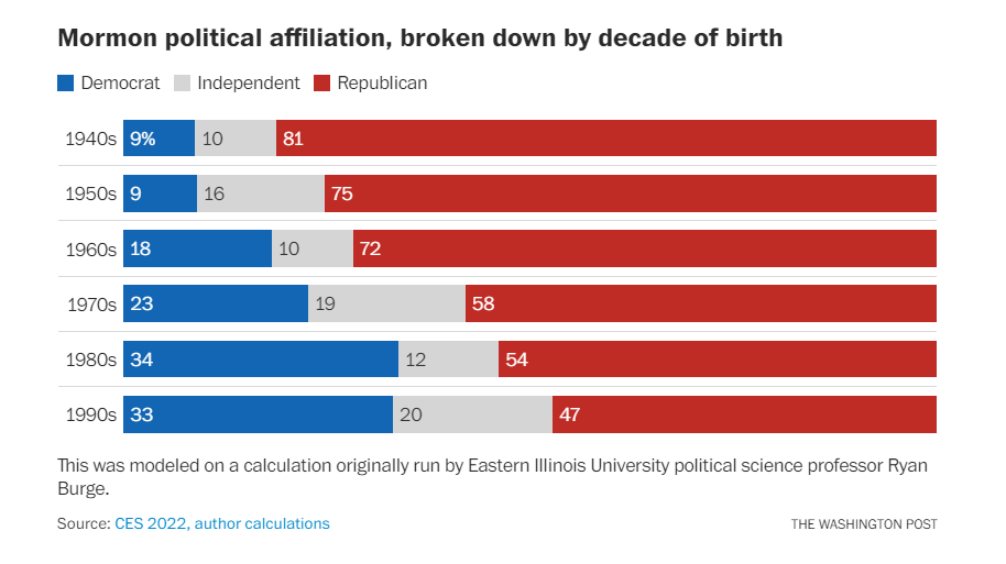 (10,702 posts)Utah could turn liberal eventually. Ive had a few siblings leave the church and it went like this: