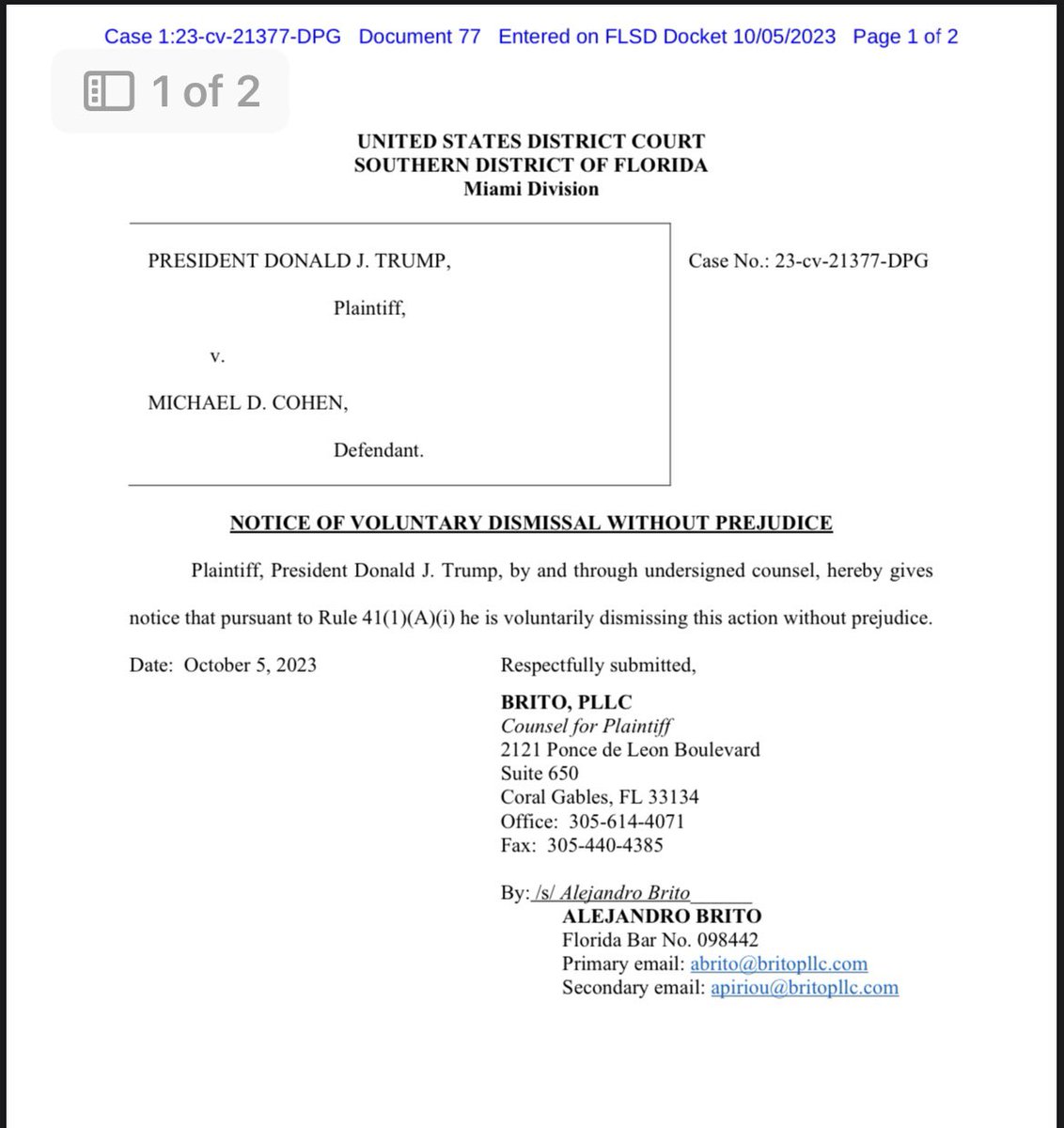 TFG has voluntarily dismissed his SDFL lawsuit against Michael Cohen. (Original Post)