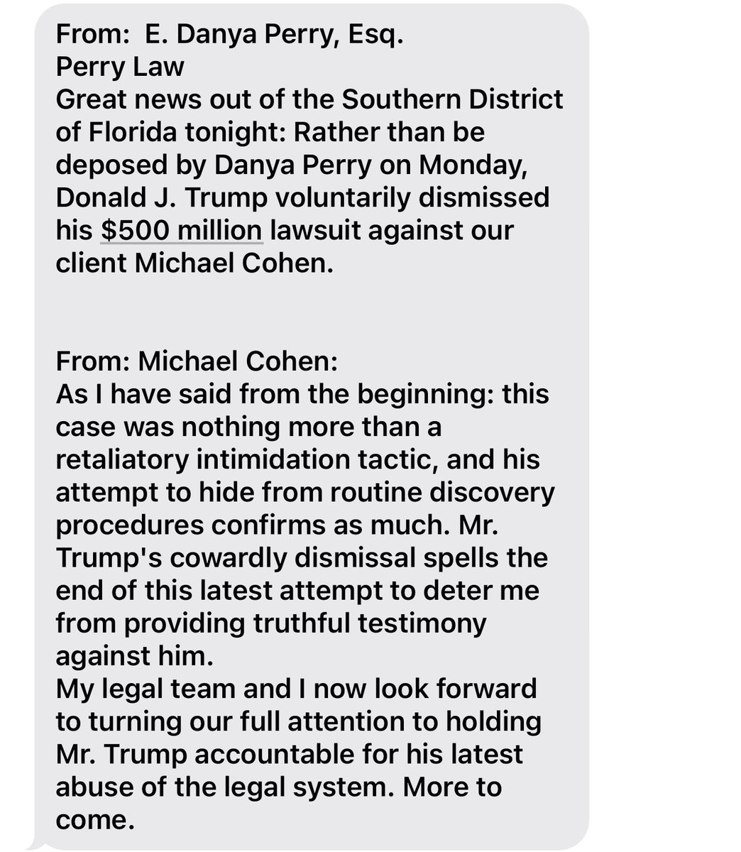 (179,822 posts)9. Michael Cohen statement on Trump dismissing the $500m suit against him: