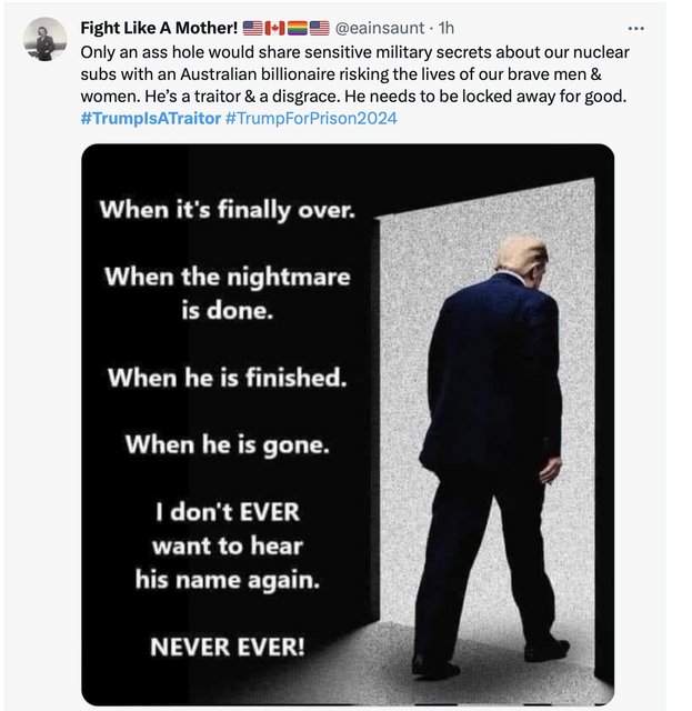 (12,623 posts)I'm for holding Trump accountable for all his crimes even using top secrets documents to write grocery lists on and telling nuclear submarine positions to Australian filthy-rich Margo Loco members.