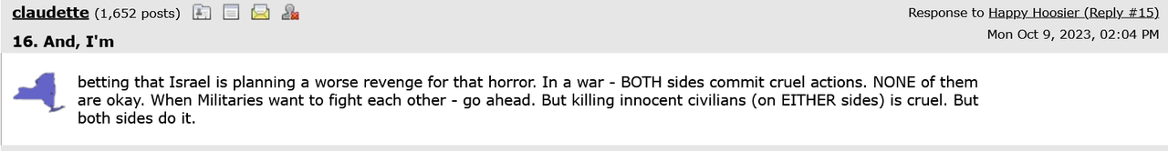 (5,455 posts)betting that Israel is planning a worse revenge for that horror. In a war - BOTH sides commit cruel actions. NONE of them are okay. When Militaries want to fight each other - go ahead. But killing innocent civilians (on EITHER sides) is cruel. But both sides do it.