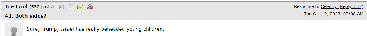 There are no Hamas supporters or sympathisers on this board (other than kamikaze troll burner accounts that are quickly snuffed out by MIRT) full stop, end of discussion.
