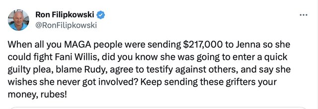 When all you MAGA people were sending $217,000 to Jenna so she could fight Fani Willis, did you know she was going to enter a quick guilty plea, blame Rudy, agree to testify against others, and say she wishes she never got involved? Keep sending these grifters your money, rubes!