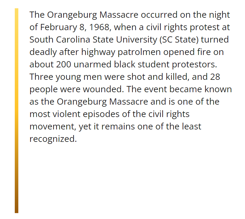 Rights struggle was over. For instance, an incident considered the bloodiest event of the civil rights era happened in Feb 1968 when cops opened fire on Black student at SC State. Most were shot in the back