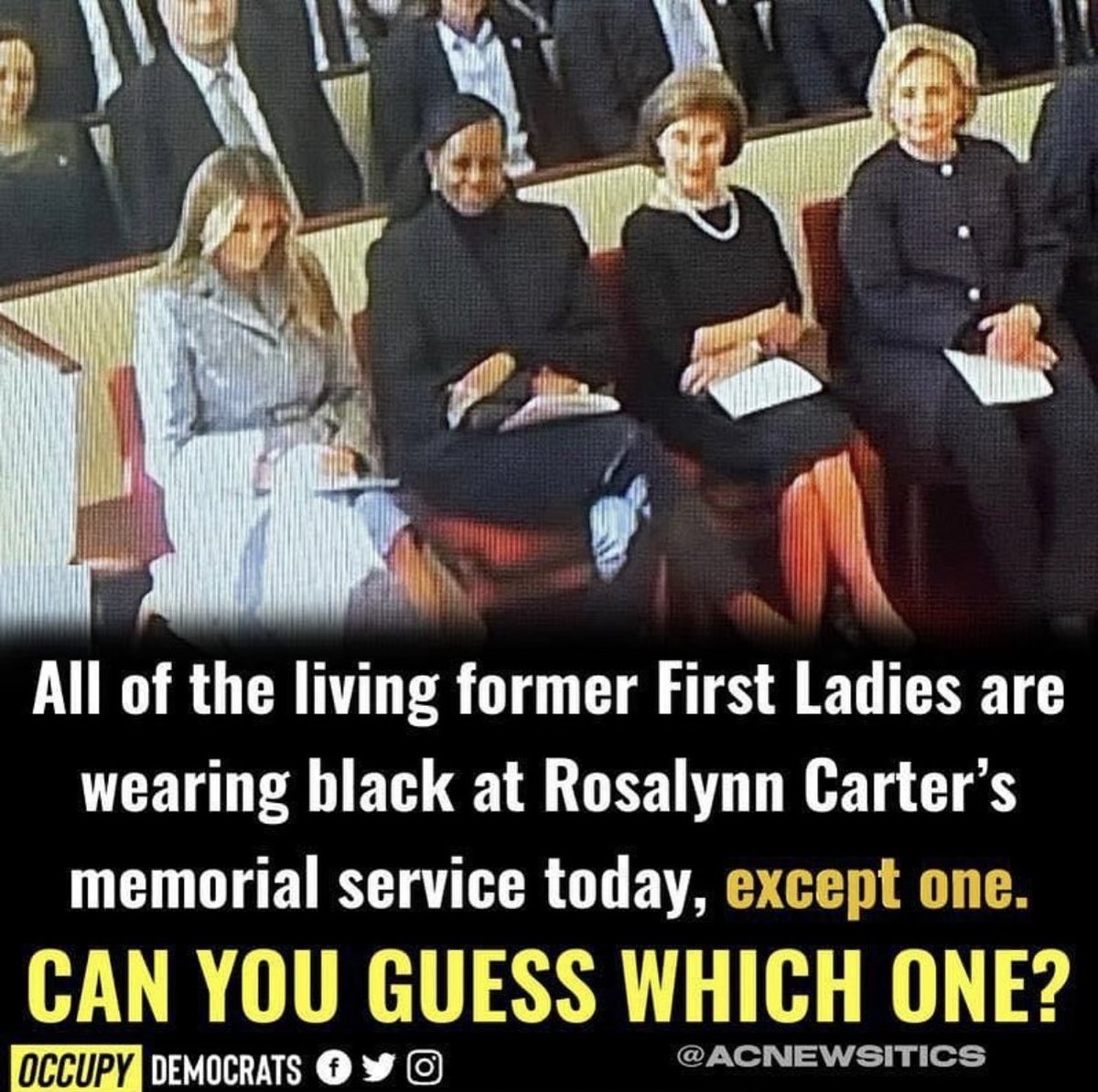 (89,294 posts)Wearing anything OTHER than black to an important, solemn, and historic event like the funeral of a former First Lady, when everybody else was wearing black with MAYBE one or two exceptions far back in the pews toward the rear of the church - it's not like she didn't know or understand the gravity of the occasion. She just wanted to stand out. And I will remember, and resent her for that selfishness, as long as I draw breath. It's NOT like she didn't know or understand the protocol required of such a gathering that would be broadcast around the world, and involving individuals and personalities known across the globe.