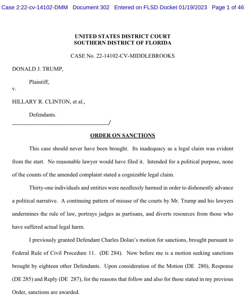 (179,869 posts)Habba needs to be sanctioned yet again. Habba and TFG were sanctioned for $1 million in the bogus Clinton RICO case they filed