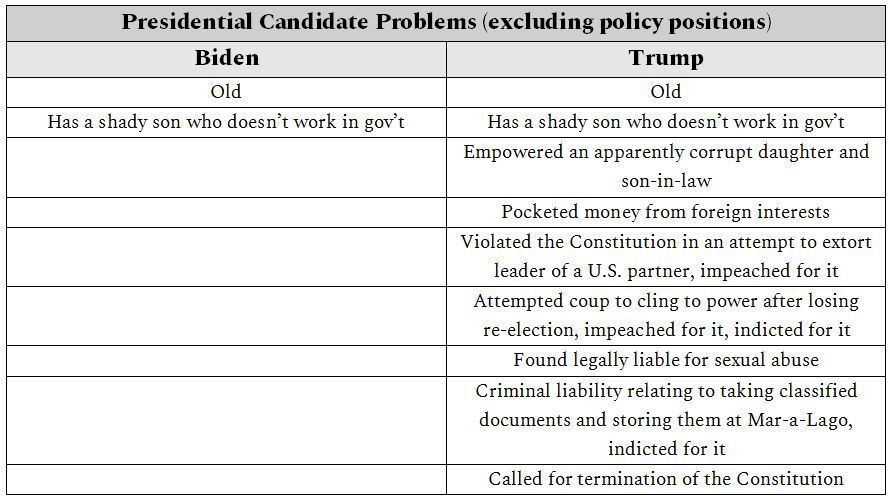 Two presumptive candidates. One is a decent honorable man. The other is evil, dishonorable and dangerous to the country and even to the world. Yet the media's focus is on Biden's mis-steps.