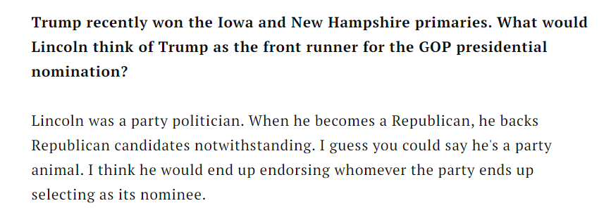 (17,432 posts)The hosts say; "you write in your book that, if he were alive today, Lincoln would likely not endorse Joe Biden, but Donald Trump".