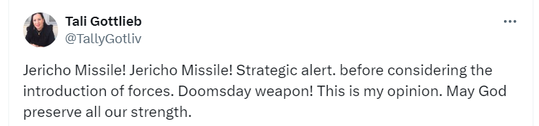 Revital "Tally" Gotliv wrote on X that she thinks it is time to fire "powerful missiles without limit."