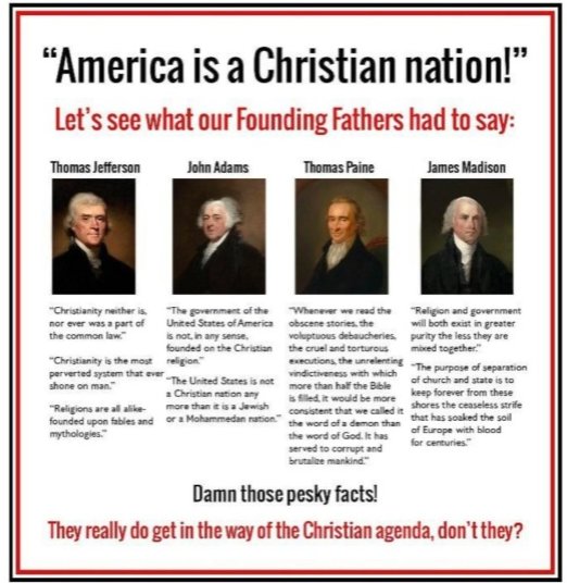 (6,933 posts)the founding fathers not being big fans of religion in general and Christianity in particular. The religious extremists believe that their twisted dreams can be mixed with reality and they "adapt" History to fit with their beliefs and fairy-tales dating back to the bronze age.