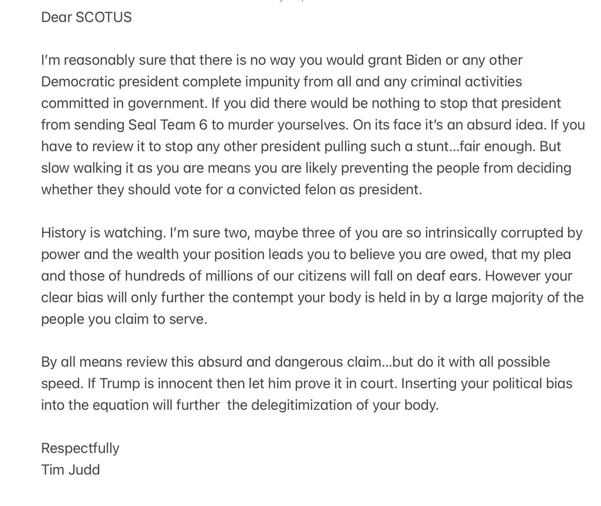 Yesterday, you once again proved that the Supreme Court does not care about the rule of law when it involves a member of your own party. First, you denied the special counsel's request to provide an expedited ruling on Donald J. Trump's request for absolute immunity. After a unanimous ruling that denied the very idea of absolute immunity by the D.C. Circuit Court of Appeals, the Supreme Court then sat on yet another Trump appeal for weeks. Yesterday, the Court finally acted and came out with this one-page ruling that grants the plaintiff (Donald J. Trump) the right to argue this absurd immunity idea before the court on an expedited basis. Only expedited in this case means seven weeks from the date the order was issued. This is delay for the sake of making sure this case never goes to trial before the election. If Trump is re-elected, this case and democracy will descend into the abyss led by the Roberts Court.