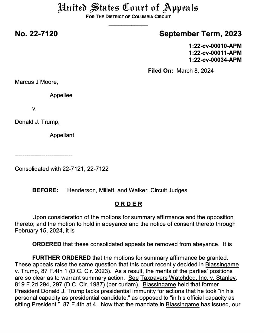 These appeals raise the same question that this court recently decided in Blassingame v. Trump. As a result, the merits of the parties positions are so clear as to warrant summary action. Blassingame held that former President Donald J. Trump lacks presidential immunity for actions that he took in his personal capacity as presidential candidate as opposed to in his official capacity as sitting President.