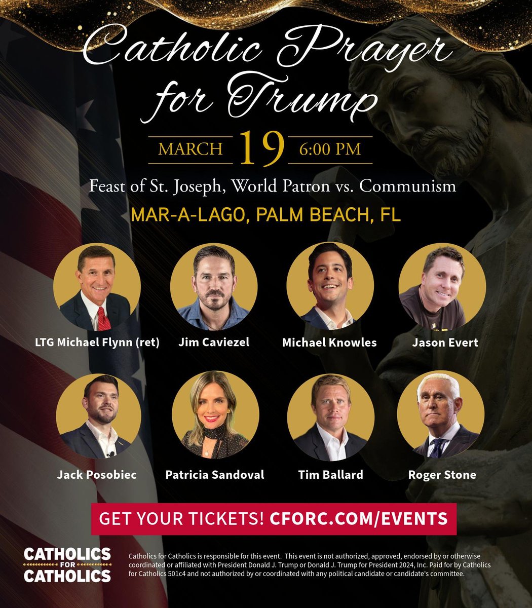 The nonprofit organization Catholics for Catholics is hosting an event called Catholic Prayer for Trump at Donald Trumps Mar-a-Lago resort in Palm Beach. The event will be held on Tuesday, March 19, which is known in the Catholic Church as St. Josephs Day or the Feast of St. Joseph. The holiday is often observed by attending mass.