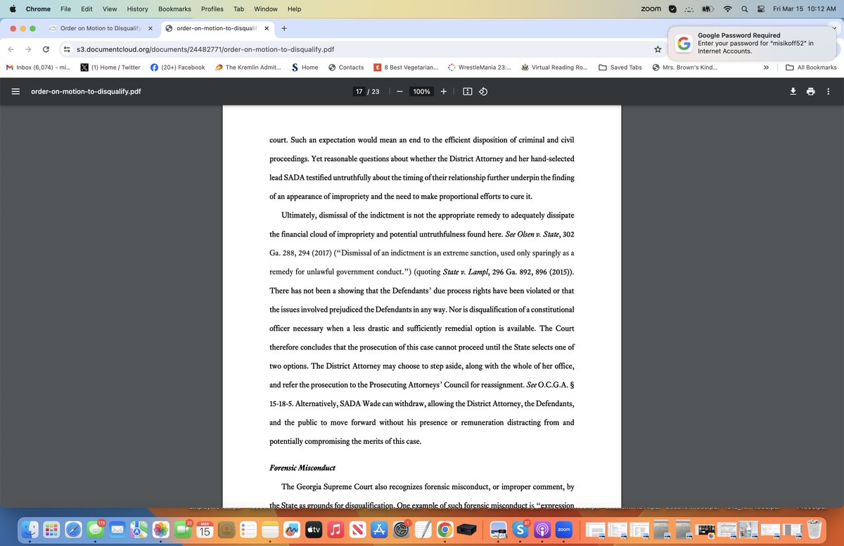 Ga judge finds no actual conflict of interest for Fani Willis in Trump RICO case, but finds appearance of one based on relationship with special prosecutor Nathan Wade, and orders Willis to choose to either withdraw from the case or dump Wade. Easy choice.