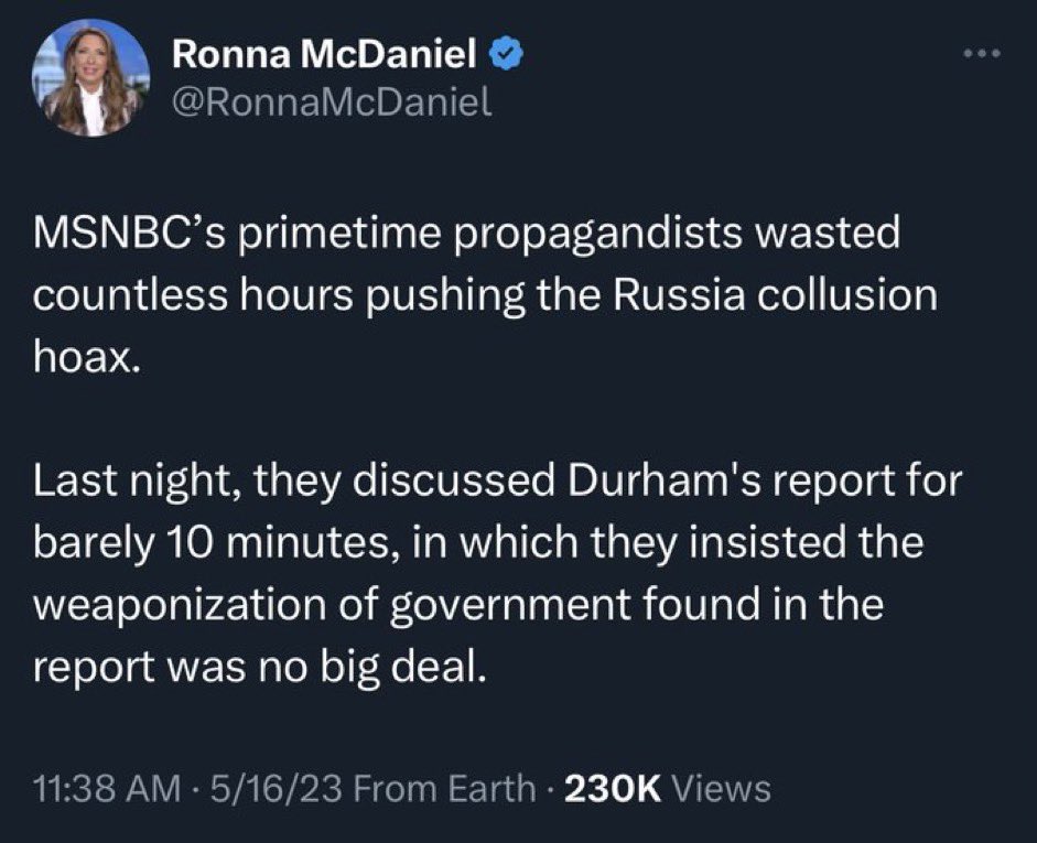 Ronna Romney McDaniel, who recently became a contributor to NBC and MSNBC began to scrub her Twitter account of old tweets that attack MSNBC, mention Democrats, and more. For example, we have now learned that McDaniel scrubbed the below tweet where she called MSNBC's primetime hosts "propagandists" and attacked them for pushing "the Russia collusion hoax." The referenced tweet was from March 16, 2023, about one year ago from today.