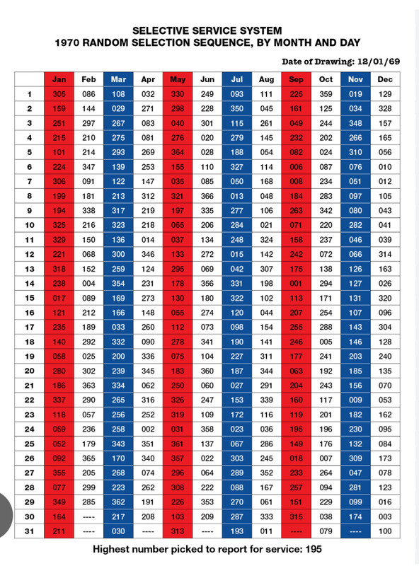 (6,501 posts)At halftime, they read out the first 20(?) drawn. Shouting and wailing by those who "won". I did not know my number until the next day. (281) There was really no "safe" number that first lottery. Each local draft board worked through the birthdays at its own rate, depending on the randomness of birthdays in its district, deferments, etc. Some unlucky and usually small districts ran through their entire lists by mid year. For the second lottery, the birthdays called were uniform across the country.