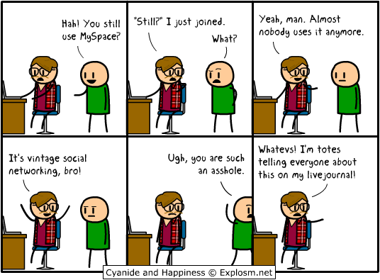 This is hilarious. Im in your age bracket and I remember being very young and very fond of computers and especially the internet before it gained critical mass. It was an absolute nightmare trying to convince anyone that this stuff wasnt just for nerds. Things like IRC where you could have actual, immediate conversations were looked at as weird and creepy. People dont even remember the older social sites like xanga, bolt or friendster. What was popular? Ad plastered AIM and MSN. Same damn thing as ICQ, which they wouldve never touched.
