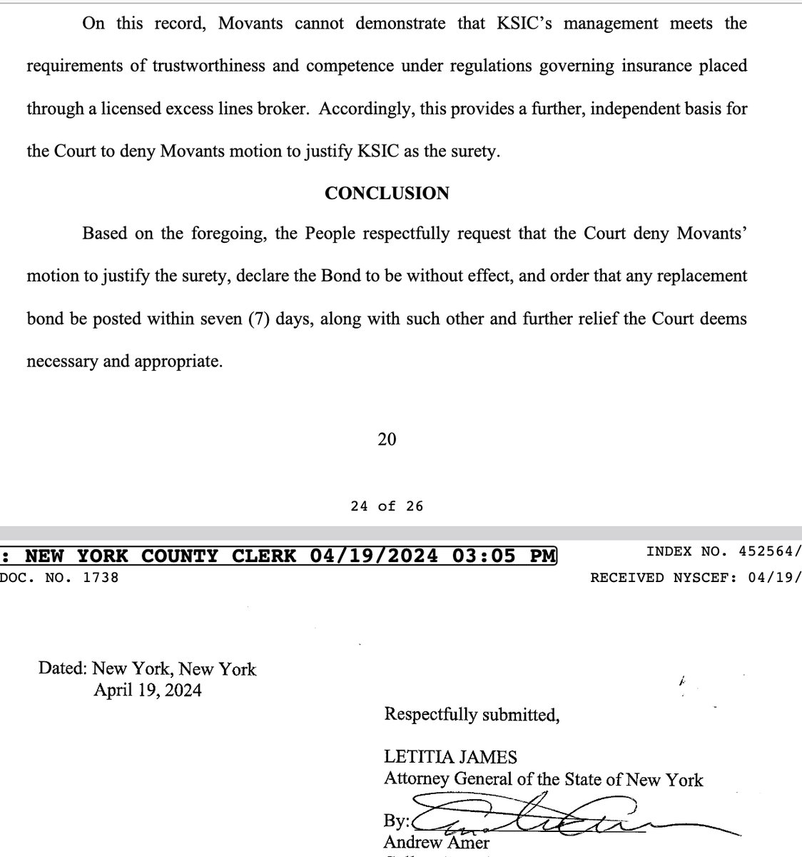 (176,745 posts)New York AG asks for the judge in Trump's civil fraud case to REJECT the Knight surety and declare the bond to be "without effect."