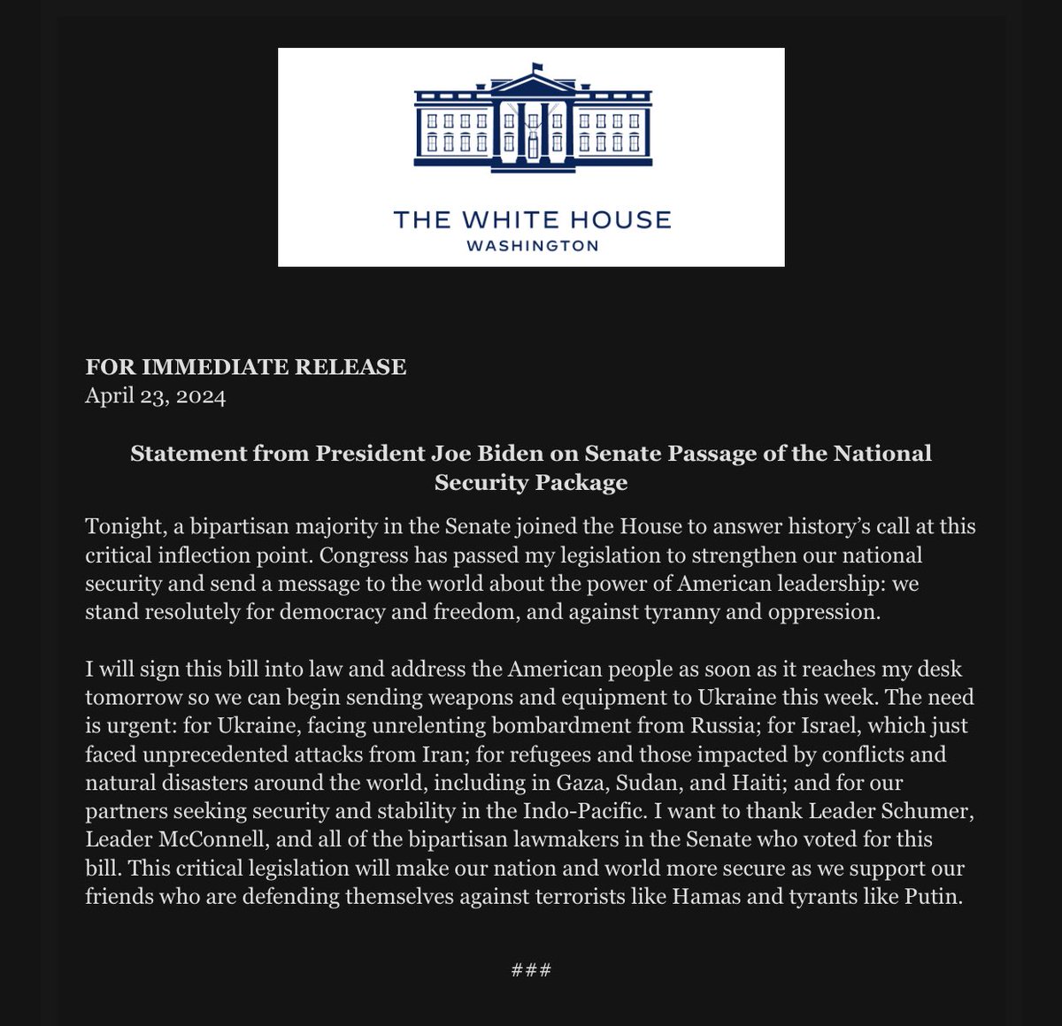 Statement from President Joe Biden on Senate Passage of National Security Package (Original Post) LetMyPeopleVote Apr 2024 OP