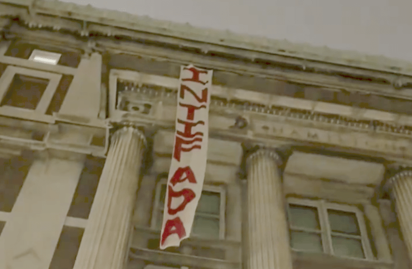 a building. But instead of waving the Confederate flag they are waving a Palestinian flag and instead of charging into the Capitol this is Columbia University.