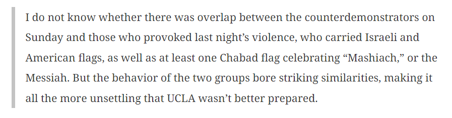 There seems to be uniform agreement that they didnt appear to be students and that they were mostly or all men. But from there any agreement breaks down. One spokesperson for the encampment said they appeared to be teenage boys. Another witness said they appeared to be grown men, and too old to be students. These contradictory accounts arent surprising. It was nighttime. The thugs were wearing balaclavas or other face coverings and it was a chaotic situation. But it seems important to have some sense of who these people were, not only so they can be arrested and punished but for our general understanding of what happened. This article in The Forward is by a Jewish UCLA history professor, David N. Myers, who was at the daytime demonstrations and counter-demonstrations and was one of several professors who interposed themselves between the two groups to try to deescalate the situation. He has this paragraph about the Tuesday night violence.