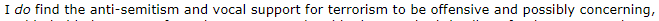 (21,061 posts)when "anti-Semitism and vocal support for terrorism" register as more than "possibly concerning".