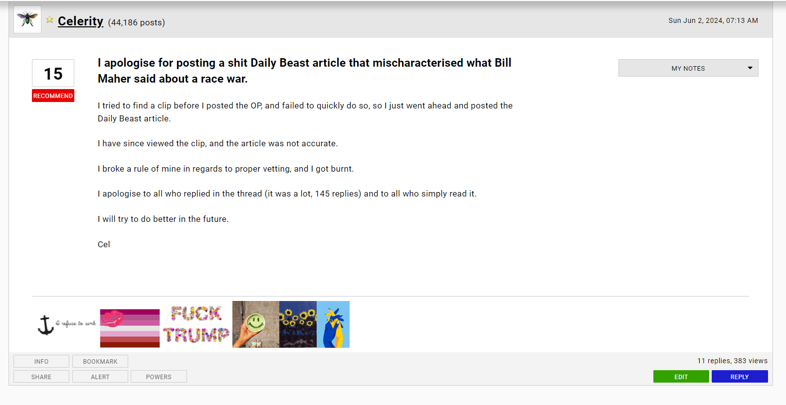 Related: Editorials & Other Articles, Issue Forums, Alliance Forums, Region ForumsI apologise for posting a shit Daily Beast article that mischaracterised what Bill Maher said about a race war.