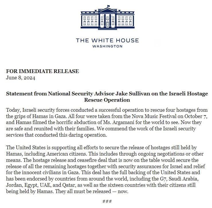 "It has been cleared for publication that in a complex operation by the IDF, Shin Bet, and the Yamam unit of the Israel police four Israeli hostages were rescued this morning (Saturday). The hostages, Noa Argamani (25), Almog Meir (21), Andrey Kozlov (27), and Shlomi Ziv (40), were kidnapped by Hamas to the Gaza Strip from the 'Nova' party on October 7th.
