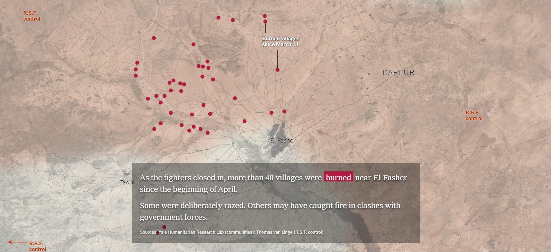 The Times analyzed videos and satellite images of El Fasher, along with imagery analysis from the Yale Humanitarian Research Lab and the Sudan Witness Project at the Centre for Information Resilience, a nonprofit organization that documents potential war crimes. The evidence shows that thousands of homes have been systematically razed and that tens of thousands of people have been forced to flee. Videos show the demeaning treatment of captives and the presence of a senior Rapid Support Forces commander recently singled out by U.S. sanctions for his role in atrocities against civilians. The Sudanese military, too, has faced accusations of war crimes, mostly for the indiscriminate bombing of civilian areas with artillery and airstrikes. On May 11, Doctors Without Borders said, the military bombed an area next to a childrens hospital.