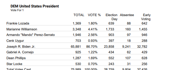 That makes the efforts of those legislators and others publicly trying to force President Biden out of the race an anti-democratic attempt to suppplant votes cast with their choice through bullying and denigrating of the man 87% of Democrats showed up to vote for, despite no serious challenger.