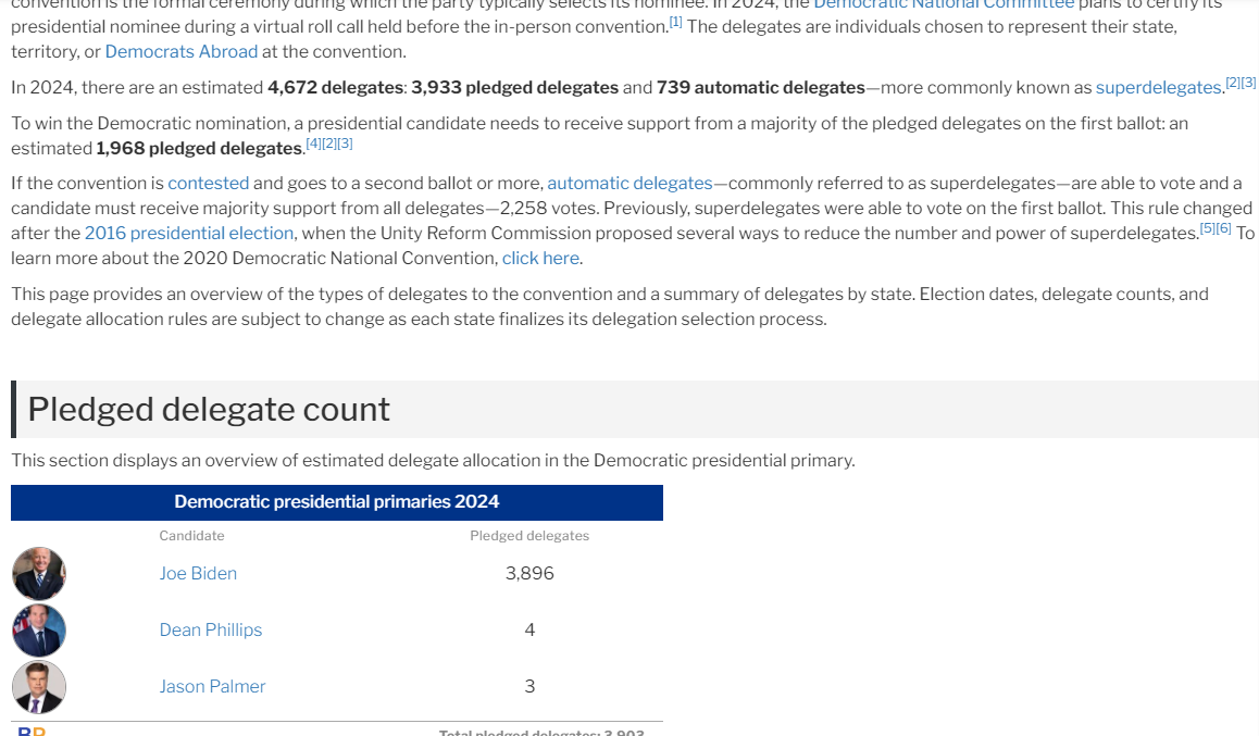 In 2024, there are an estimated 4,672 delegates: 3,933 pledged delegates and 739 automatic delegatesmore commonly known as superdelegates.[2][3]
