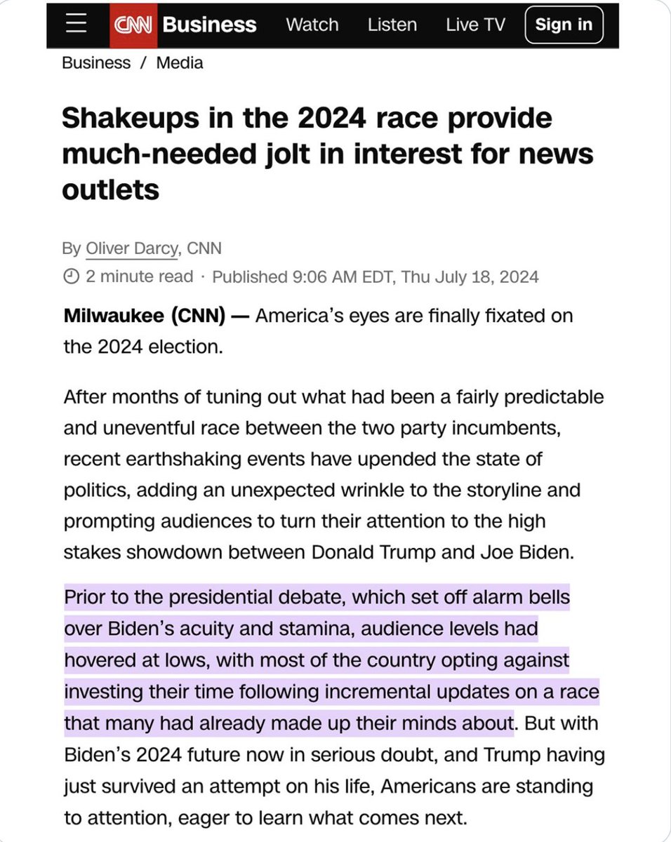 This whole thing has taken on the dimensions of a propaganda exercise. In the last two days I've seen headlines from supposedly respected and reputable news outlets (which, by definition, leaves out Faux and its ilk) describing Biden "in crisis", "embattled", "feeble", and "flailing" (good job at being neutral, guys). I've shared this link (https://www.washingtonpost.com/opinions/2024/03/15/kamala-harris-quit-biden-2024/) to Kathleen Parker's opinion piece from March of this year which appeared to have deservedly died without a whimper, but she at least had the guts to give a public facing front to what's been the mindset of more than a few. When it makes no sense how a very successful president has had such challenging polling and approval numbers, it's because the folks who try to set the agenda have lazily bought into the proxy rather than digging deeper for the uncomfortable truth.