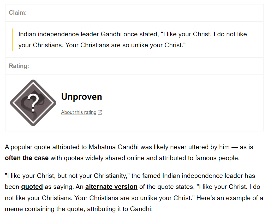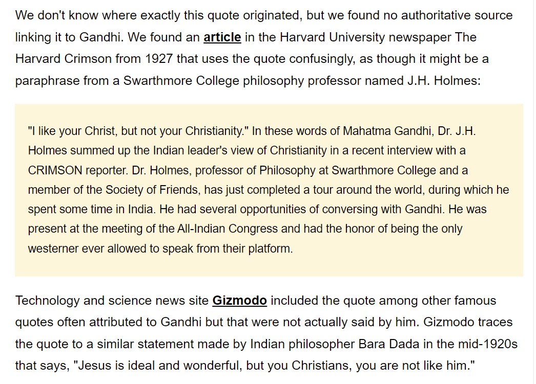 (48,866 posts)Mahatma Gandhi. That's the best explanation I can give. I think now they are so much worse than they were when he said that. Just be a beacon for your religion. Maybe it will spread.