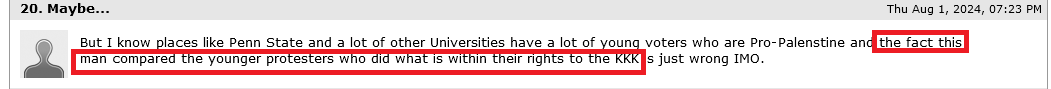 (743 posts)But I know places like Penn State and a lot of other Universities have a lot of young voters who are Pro-Palenstine and the fact this man compared the younger protesters who did what is within their rights to the KKK is just wrong IMO.