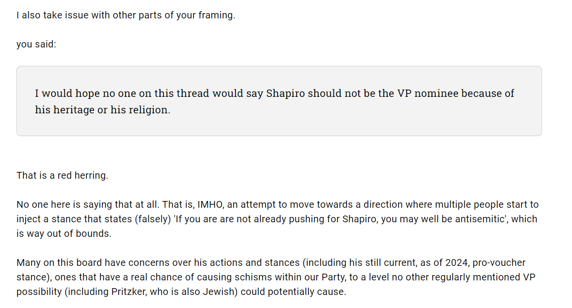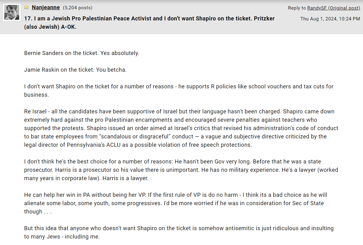 (38,717 posts)but fair or not, Shapiro would be the most controversial choice among otherwise Dem-voting Antizionists, who were already threatening to withhold their votes from Biden over Gaza.