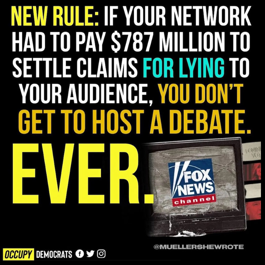 But, no to a debate on Fox. Stick to the venue originally chosen. Or, don't debate at all. ABC can make a program around an empty podium. Kamala will look Presidential and vibrant, and can talk to the American people. We are going to kick Trump's ass.