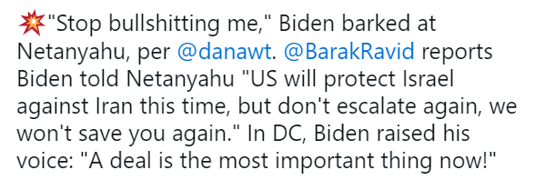 💥"Stop bullshitting me," Biden barked at Netanyahu, per @danawt. @BarakRavid reports Biden told Netanyahu "US will protect Israel against Iran this time, but don't escalate again, we won't save you again." In DC, Biden raised his voice: "A deal is the most important thing now!"