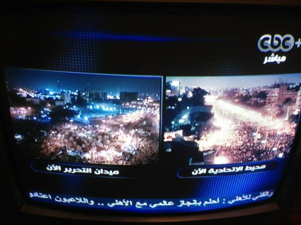 TV picture showing both Tahrir & Presidential Palace from a high place. Stunning. Unbelievable. شوفوا دي. pic.twitter.com/YERvJQeS