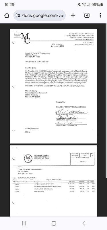 Back in 2018, Trump visited Montana four times, holding rallies in Billings, Bozeman, Great Falls and Missoula. Officials with Missoula County confirmed and sent NBC Montana the invoice showing $12,922.82 is still owed. That breaks down to $10,835.41 for officer salaries, $1,059.26 for dispatcher salaries, $693.72 for Office of Emergency Management and $334.43 for miscellaneous expenses.