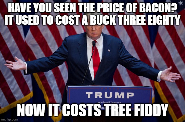 I'm betting that demented motherfucker never stepped foot in a grocery store in his life, let along bought a pound of bacon. No way he's capable of correctly answering that or any grocery-related question. All he has is bullshit and lies, and it boggles my mind that anyone listens to a word this bag of shit says, let alone believe him.