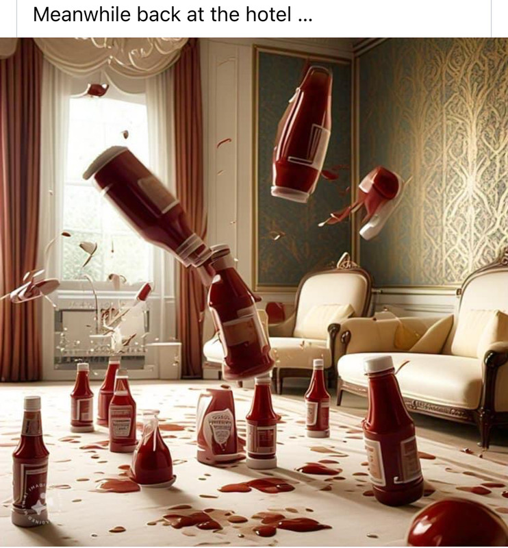 (2,926 posts)whoever assigned the rooms for TSF's delegation better have had a list of rooms due for redecoration so they can start the contract right away. (I don't think Jackson Pollock knock-offs in ketchup is particularly hygienic nor what they're going for, esthetically, so better to contribute to the economy by getting a remodel.)