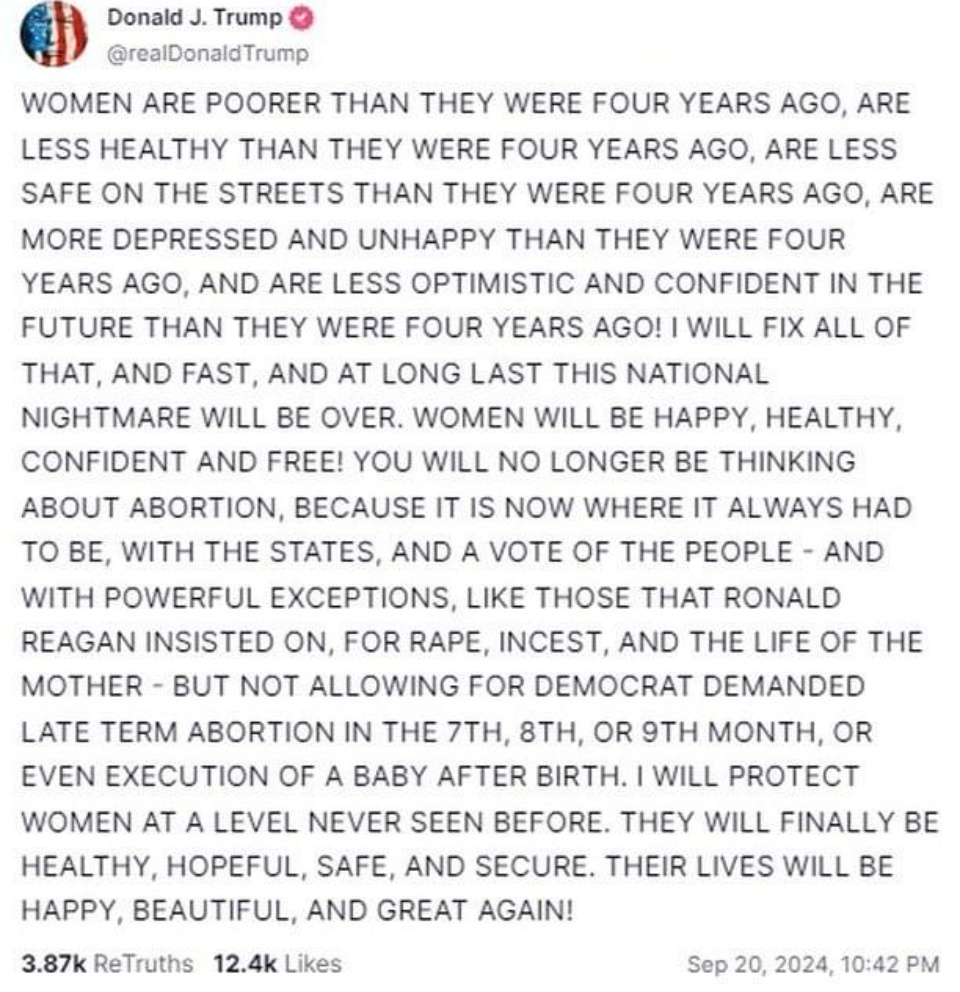 (27,630 posts)While he may have dictated his thoughts, someone else put it together to make a clearer positional statement. Most of his longer diatribes are all over the place. This one was organized and articulate with a couple of Trumperisms like the last sentence...."I will protect women at a level never seen before; etc, etc, etc." Clearly his contribution.