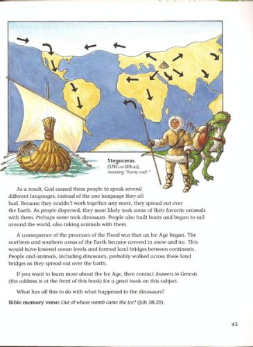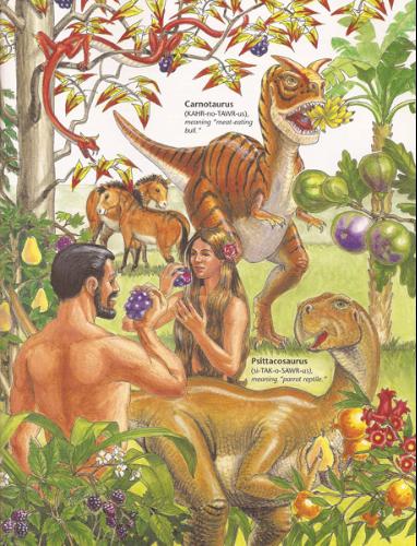 But Ham DID publish a book called "Dinosaurs in Eden". And it DID make the argument that things like carnivorous dinosaurs spent their days side by side with Adam and Eve doing things like eating bananas. And then later on people riding them around with the freaking Pyramids in the background.