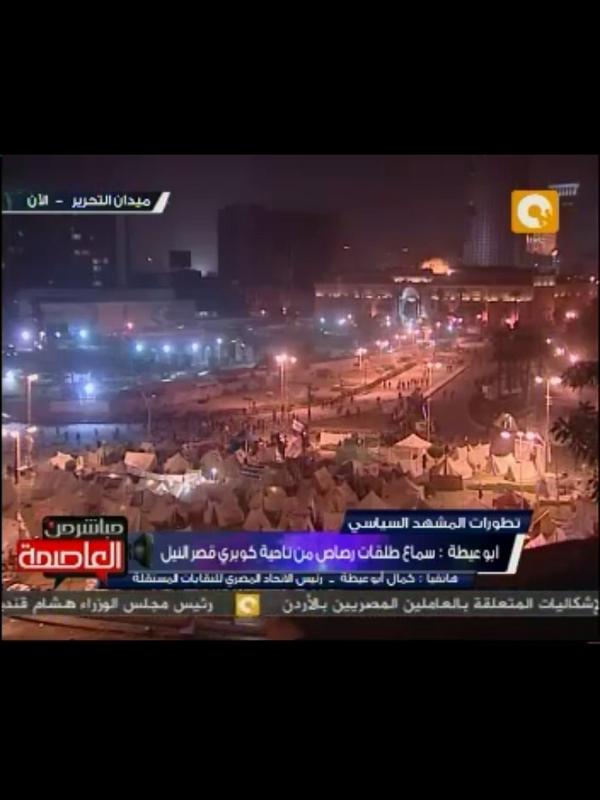 Gunfire is from three sides According to ONTVLive : Abdel Monem Riad, Qasr El Nile, Omar Makram's in #Tahrir